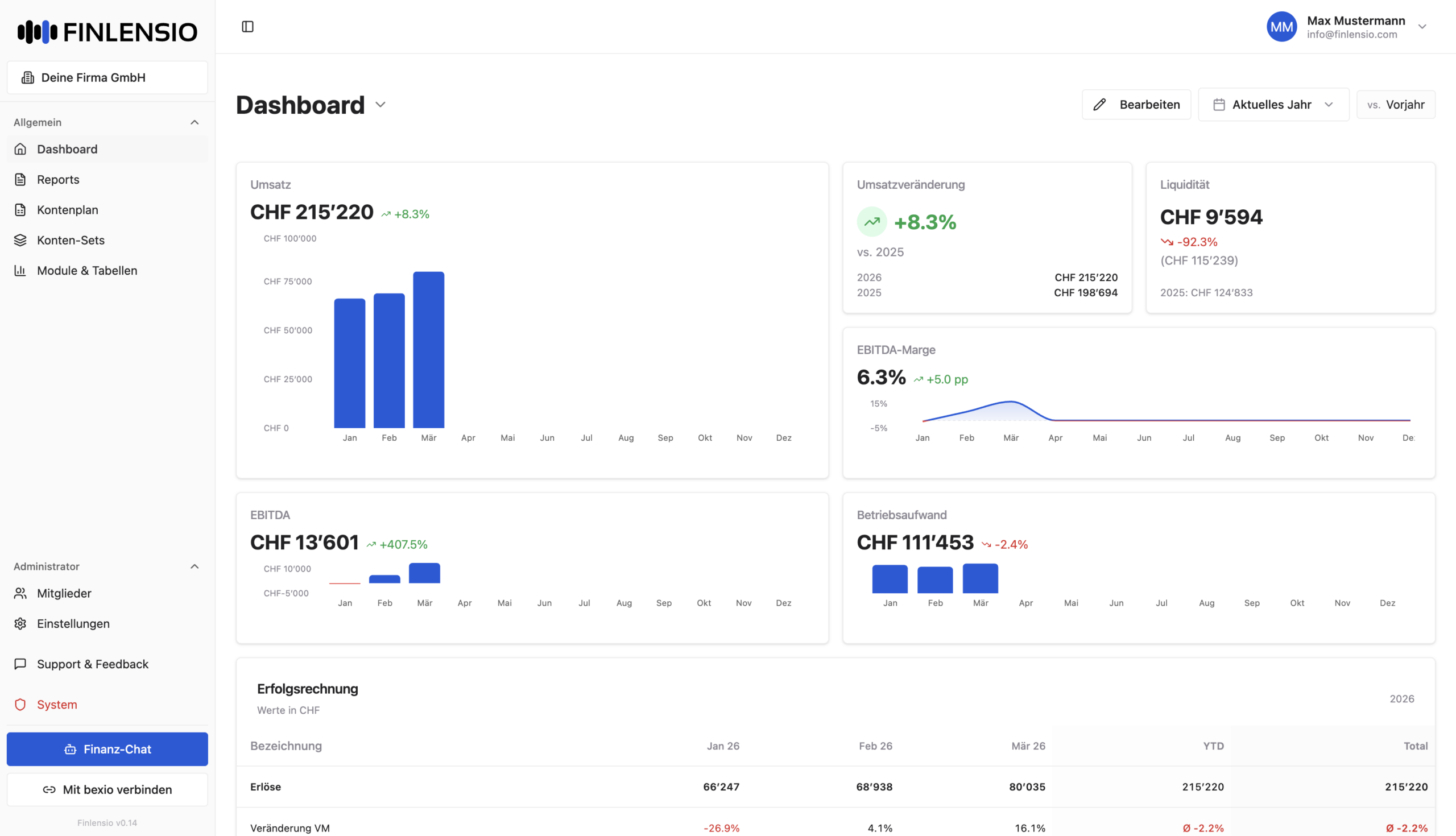 Finlensio verwandelt Deine Finanzzahlen in Echtzeit-Dashboards, Forecasts und AI-Driven Insights. Professionelle Finanzsteuerung für Startups und KMUs – ohne eigenen CFO.
